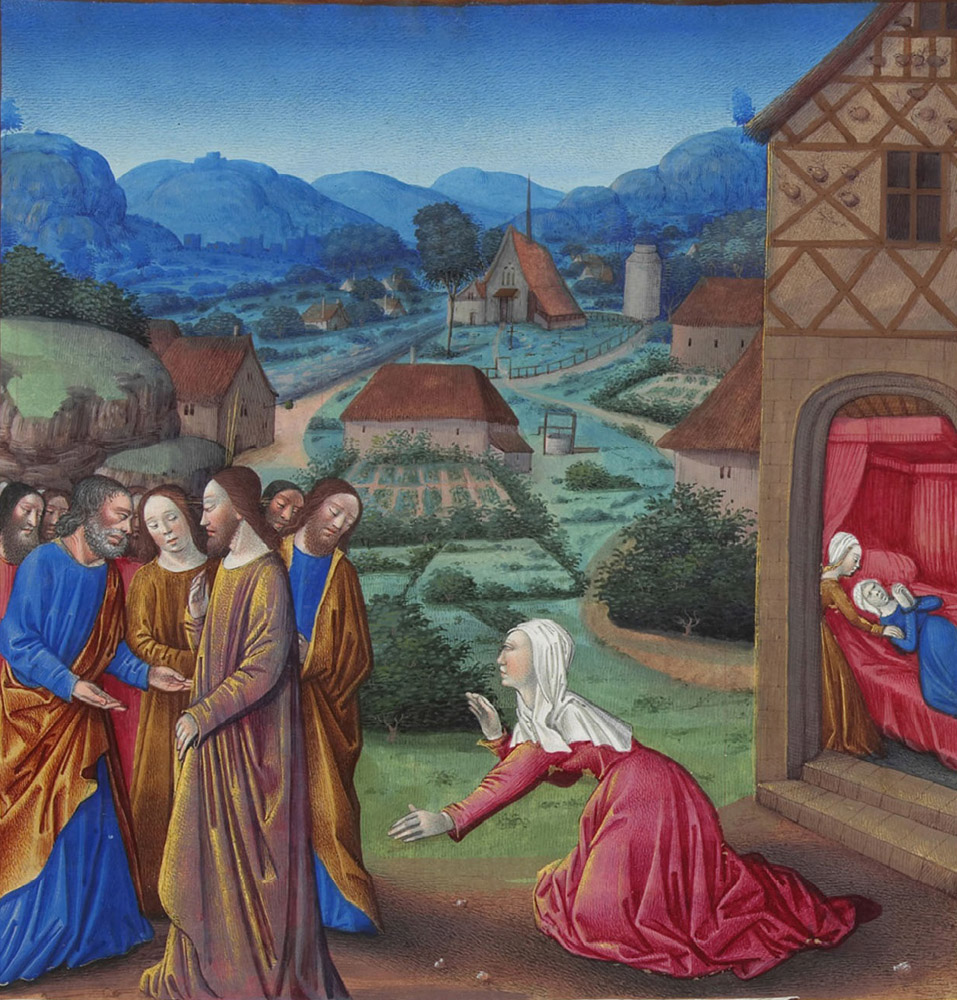 - Paul, Jean et Herman de Limbourg, miniature, 1411-1416, Les Très Riches Heures du duc de Berry, Ms 65, Musée Condé, Chantilly, France. Jean, duc de Berry, a commandé ce livre d’heures aux frères de Limbourg, néerlandais. Après leur décès en 1216, d’autres artistes ont poursuivi le travail. Le style est le gothique international, avec des couleurs vives, dont un bleu très présent. Les paysages s’inspirent de lieux et d’édifices de France, peints avec finesse. Ici, nous ne sommes pas au bord de la mer. Jaïre s’adresse à Jésus, le supplie (cf. ses mains); à droite, on voit sa fille mourante dans un lit à baldaquin. Disciples et foule sont proches de Jésus. La femme, agenouillée, veut toucher son vêtement. Finalement, cette miniature intègre beaucoup d’éléments !