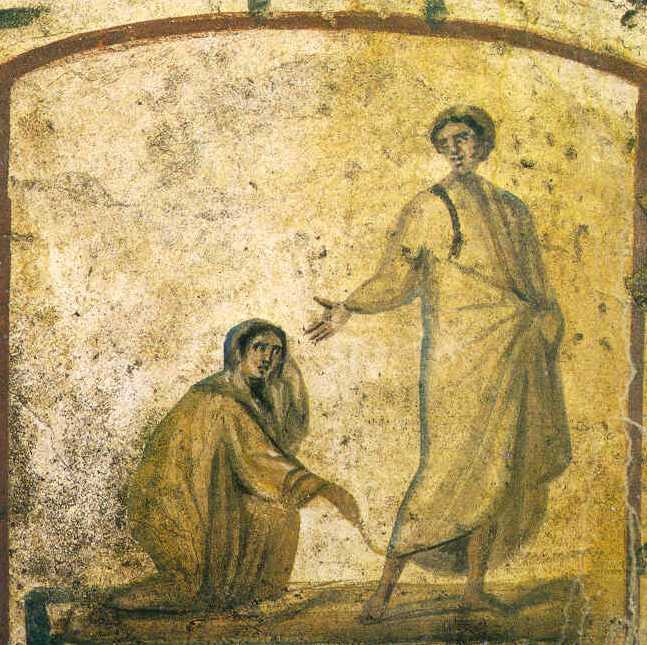 - Fresque, c.310-325, Catacombes des saints Marcellin et Pierre (martyrs en 304), Rome, Italie. Les catacombes étaient des cimetières souterrains où les chrétiens, comme d’autres, enterraient leurs morts. Des fresques étaient peintes dans ces caveaux, exprimant la foi chrétienne et l’espérance d’une vie nouvelle. Ici, seuls Jésus et la femme sont présents. Celle-ci, agenouillée, s’approche et touche le vêtement; Jésus se tourne vers elle et lui dit : « Ta confiance t’a sauvée, va en paix ». Les deux sont vêtus à la romaine ; Jésus, jeune homme imberbe aux pieds nus, porte la toge avec une bordure pourpre, signe d’un rang élevé. Déjà, au début même de l’art chrétien, il y inculturation.