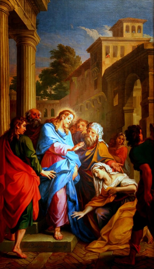 - Louis de Boullogne le Jeune, 1695, Musée des Beaux-Arts, Rennes, France. Ce peintre de Paris, fils du graveur Louis Boullogne, fut nommé peintre du roi en 1724 et anobli. Ce tableau fut fait, avec d’autres, pour les Chartreux. C’est une œuvre construite avec un souci d’équilibre : les vêtements et le jeu de couleurs, l’architecture développée, les arbres et le ciel, la présence de plusieurs figures du récit. Jésus, au centre, irradie de lumière et bénit la femme. Celle-ci est à genoux devant lui mais touche son vêtement, avec respect. À gauche, Jean et Pierre ; près de Jésus, Jaïre implorant pour sa fille. D’autres figures évoquent la foule.
