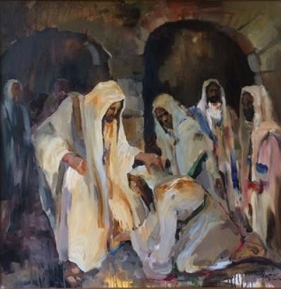 - Dirk Walker, 20e siècle, Canterbury United Methodist Church, Mountain Brook, Alabama, États-Unis. Cet artiste de l’Alabama peint en plusieurs domaines, comme les paysages, les sports, les cités. Il a fait une série de peintures spirituelles, dans un style qu’il qualifie de réalisme abstrait. La femme est aux pieds de Jésus avec crainte. Le blanc domine, unissant les figures.