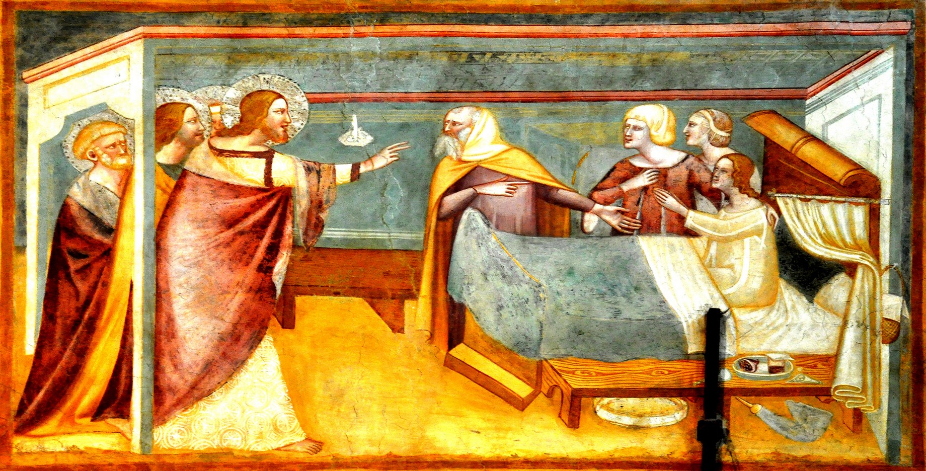 - Vitale da Bologna, fresque, c.1360-1361, abbaye Pomposa, Codigoro, Italie. Ce peintre de Bologne, avec son atelier, a réalisé un ensemble de fresques dans l’église de ce monastère bénédictin près de Ferrare, au Nord de l’Italie. Jésus, accompagné de Pierre, Jacques et Jean, tend la main vers la fille, l’invitant à se lever. Elle répond en se relevant et tendant les mains vers lui. Les parents sont à son côté, le père la désignant à Jésus. Nous sommes dans une chambre. Dans un plat, près du lit, se trouve la nourriture. Plusieurs éléments du récit sont intégrés et la scène est très vivante.