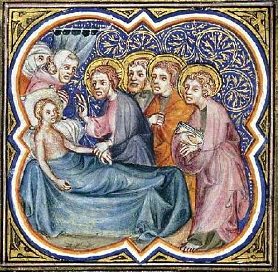 - Miniature, 1372, Bible Historiale, Musée Meermanno, La Haye, Pays-Bas. Cette Bible est une traduction en français de textes de la Vulgate, avec des commentaires de Petrus Comestor, un théologien du 12e siècle, enseignant à Troyes et Paris. Ce manuscrit a été commandé pour le roi de France, Charles V. Les enluminures, nombreuses, ont été faites par l’atelier parisien du Maître des Boqueteaux. Les parents sont derrière leur fille étendue sur un lit. Jésus lui tient la main et la bénit ; elle est éveillée. Jésus et la fille communiquent par le regard. Les trois disciples sont à droite. Tout est là, sur un fond doré et bleu.