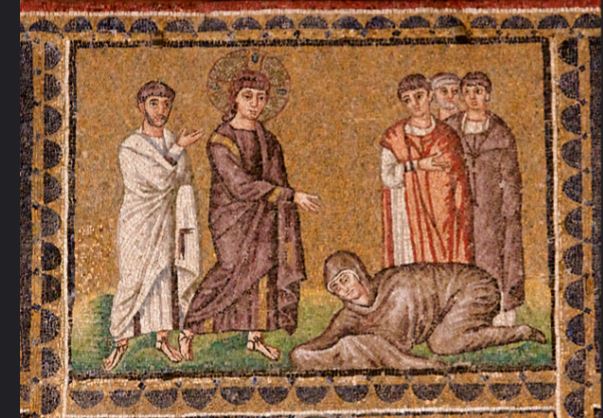 - Mosaïque, 6e siècle, Basilique St-Apollinaire-le-Neuf, Ravenne, Italie. Cette église ancienne, une basilique au sens architectural, contient de nombreuses mosaïques de scènes bibliques. À gauche, un disciple désigne Jésus de la main, nous invitant à nous tourner vers lui, comme en d’autres mosaïques. La femme est à genoux devant Jésus, ce qui vient après avoir touché le vêtement. Jésus, jeune homme imberbe et bien mis, mais largement nimbé et portant de fines sandales, bénit la femme. À droite, témoins de la scène, trois figures, foule ou disciples.