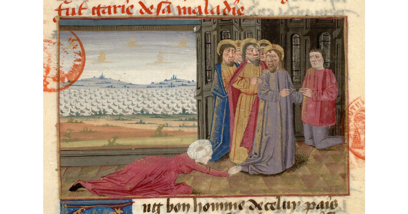 - Miniature, c.1470-1480, Vie de Jésus Christ, Ms 976, folio 45, Bibliothèque Mazarine, Paris, France. Cet ouvrage, écrit en français, contient des textes de Jean Gerson (1363-1429), théologien et éducateur, qui fut chancelier de l’Université de Paris. On ne connait pas l’atelier qui a fait les enluminures. Le décor est rural et la scène semble se passer à l’intérieur et non dans la rue. À droite, Jaïre est à genoux pour supplier Jésus. À gauche, la femme, qui est bien vêtue, s’étend pour toucher le vêtement. Dans certains courants médiévaux, elle était identifiée à Marthe, sœur de Marie et Lazare. Jésus et ses disciples ont une allure rébarbative et semblent ennuyés ou peu réceptifs. Cela arrive.