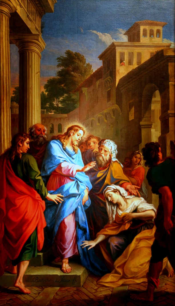 - Louis de Boullogne le Jeune, 1695, Musée des Beaux-Arts, Rennes, France. Ce peintre de Paris, fils du graveur Louis Boullogne, fut nommé peintre du roi en 1724 et anobli. Ce tableau fut fait, avec d’autres, pour les Chartreux. C’est une œuvre construite avec un souci d’équilibre : les vêtements et le jeu de couleurs, l’architecture développée, les arbres et le ciel, la présence de plusieurs figures du récit. Jésus, au centre, irradie de lumière et bénit la femme. Celle-ci est à genoux devant lui mais touche son vêtement, avec respect. À gauche, Jean et Pierre ; près de Jésus, Jaïre implorant pour sa fille. D’autres figures évoquent la foule.