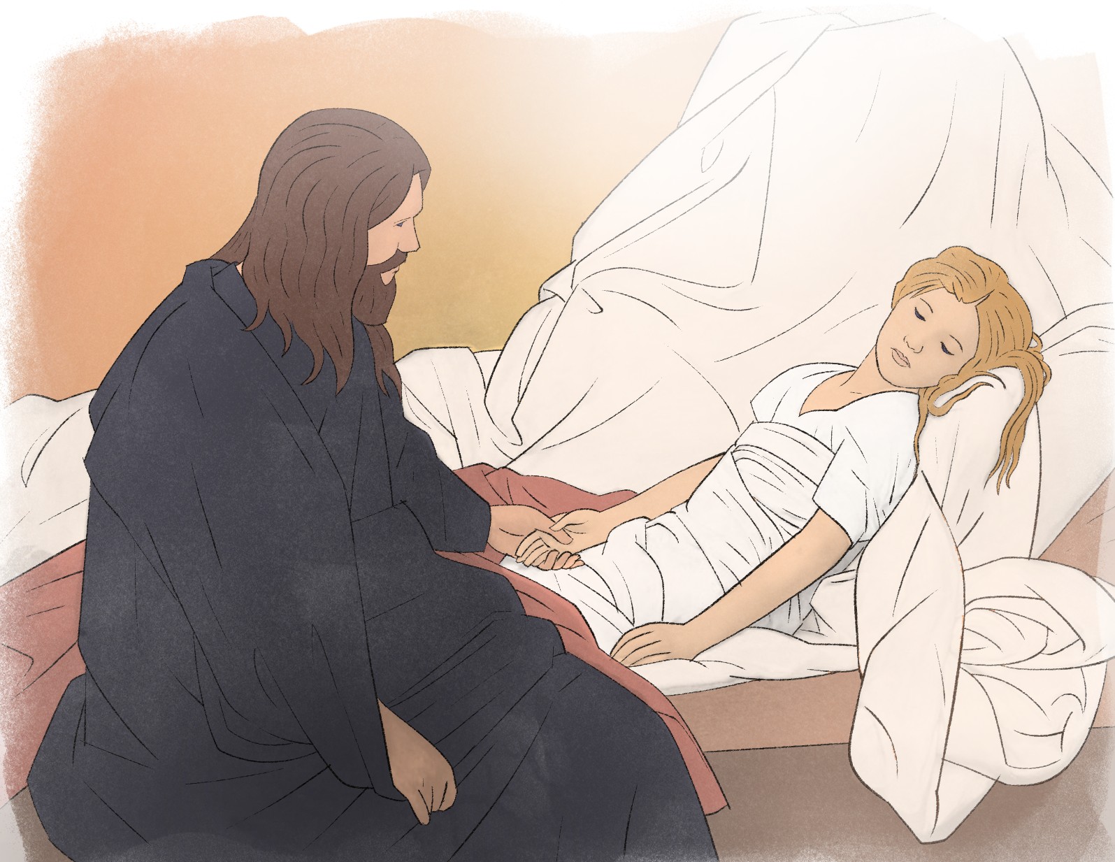La rencontre avec la fille a lieu dans la maison de Jaïre. En Marc, comme en Luc, Jésus est accompagné de trois disciples, Pierre, Jacques et Jean, les mêmes qu’à la transfiguration (9,2) et à Gethsémani (14,33). Les parents sont présents et Jésus met dehors les pleureurs. En Mathieu (9,23-25), Jésus est seul. Avec tous ces personnages, il y a du jeu dans les images, selon le moment choisi ou l’angle de vision. La jeune fille, qui a douze ans, a parfois plutôt l’air d’une jeune femme ou d’une enfant. Jésus lui tient la main. Le décor, là aussi, peut être plus ou moins élaboré : lit et meubles, draps et vêtements, fenêtre et éclairage.