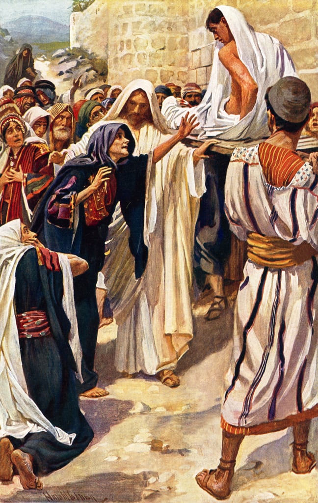 - Harold Copping, 1927, Women of the Bible, Religious Tract Society, London, Angleterre. Comme Tissot, ce peintre de Londres a illustré la Bible avec un souci de prendre en compte le contexte et de rendre vivantes les scènes. Ici, tous les personnages sont proches. La scène se passe près d’un mur de la ville. Jésus est tourné vers la veuve, qui tend les bras vers son fils, qui s’est redressé sur sa civière. Disciples et foule entourent Jésus, la mère et le jeune homme. Des regards sont échangés.