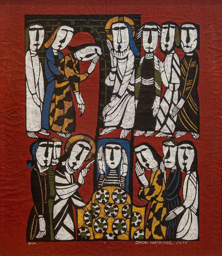 - Sadao Watanabé, estampe, 1973, Collection privée, Japon. Cet artiste chrétien intègre des techniques d’un art populaire japonais, le mingei. L’œuvre comprend deux parties. En haut, Jésus nimbé est au centre; à droite, on voit trois disciples; à gauche, la veuve en pleur, penchée, qui est accompagnée de deux figures dont l’une la soutient. En bas, Jésus est à gauche et la veuve à droite; au centre, se trouve le jeune homme, qui s’éveille à l’appel de Jésus.