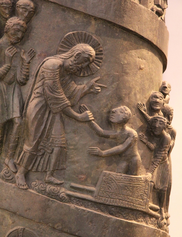 - Relief de bronze, c.1020, Colonne Bernward, Cathédrale d’Hildesheim, Allemagne. Cette colonne a été commandée par Bernward, évêque d’Hildesheim, pour l’église St-Michel; elle était située derrière l’autel. Au 19ème siècle, elle fut déménagée dans la cathédrale. De style ottonien et s’inspirant de la colonne de Trajan à Rome, avec sa spirale, elle comprend vingt-huit scènes de la vie de Jésus, de son baptême à l’entrée à Jérusalem. Jésus, nimbé et majestueux, relève le jeune homme nu. Un disciple est derrière Jésus; la mère et la foule, derrière le fils. Ils s’agrippent un peu à la colonne pour ne pas tomber de haut!