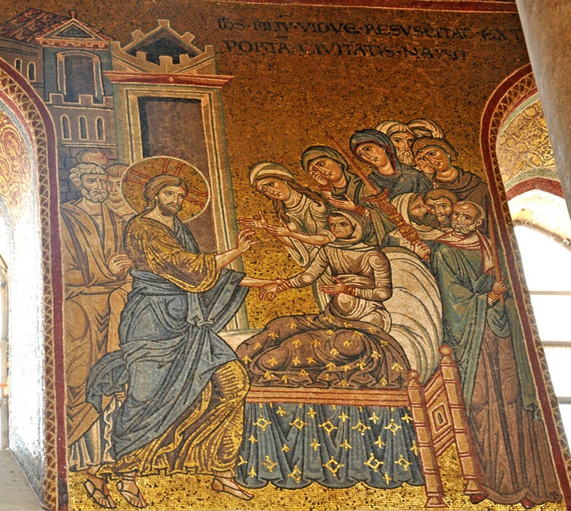 - Mosaïque, 1179-1182, Cathédrale de l’Assomption, Monreale (Sicile), Italie. Cette église comprend un grand ensemble de mosaïques de style byzantin, dont un cycle sur la vie du Christ qui est solennel, comme la figure du Pantocrator des icônes. Ici, plusieurs éléments sont semblables au relèvement de la fille de Jaïre. Jésus appelle le fils à se réveiller et tient sa main. Trois disciples sont derrière lui. Le jeune homme est bien redressé, les yeux ouverts. Plusieurs figures sont proches de lui, dont sa mère, d’autres femmes, des porteurs, des témoins. Toutefois, sa civière ressemble plus à un lit, avec de beaux tissus ! La ville est à gauche, avec porte et édifices.