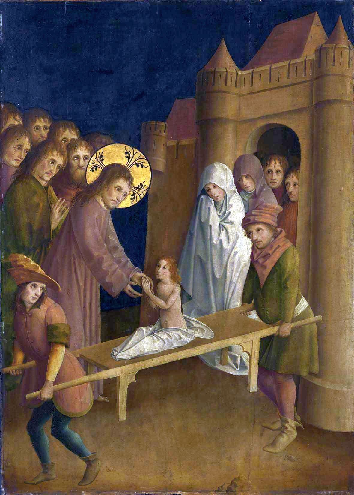 - Maître de la Passion de Darmstädter, c.1450-1460, Alte Pinakothek, Munich, Allemagne. Ce peintre allemand, dont on ignore le nom, a été influencé par le gothique international et le réalisme flamand, avec un travail personnel sur la lumière. Ce panneau faisait partie d’un retable. Jésus, bien nimbé, touche le jeune homme, qui a l’air d’un petit garçon! Ses disciples, aux yeux ouverts, sont derrière lui. La jeune mère, en blanc, avec une compagne, se trouve devant la porte de la ville, plutôt étroite, où deux figures de la foule peuvent être vues. Les porteurs sont présentés avec vivacité, à l’avant-scène.