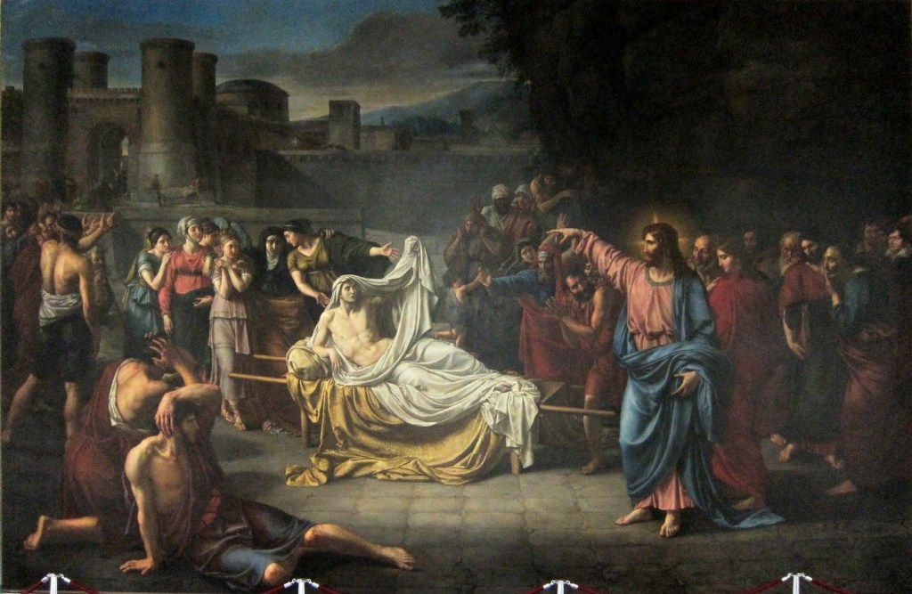 - Jean-Baptiste Wicar, 1816, Palais des Beaux-Arts, Lille, France. Originaire de Lille et formé à Paris, chez le néo-classique Jacques-Louis David, puis à Rome, ce peintre a vécu surtout en Italie. Il a fait des portraits et des scènes historiques, qui ont eu beaucoup de succès à son époque. Cette oeuvre est de très grand format : 5.7 x 9 mètres! Il y a de la place pour toute le monde, et pour d’autres. La porte, les murs et les tours de la ville sont bien visibles. Le jeune homme sur sa civière, au centre du tableau, revient à la vie et soulève son suaire. Jésus à droite l’appelle à se lever; des disciples l’accompagnent dont Jean et Pierre. Derrière le fils, se trouve sa mère et plusieurs femmes. Une foule nombreuse réagit à l’événement. À l’extrême-droite du tableau, un autoportrait du peintre; et à l’extrême-gauche, un portrait de son maitre David. Plusieurs figures, postures et éléments du tableau font référence à des œuvres d’autres peintres, portant sur des scènes antiques; comme une synthèse, ou des clins d’œil pour les connaisseurs.