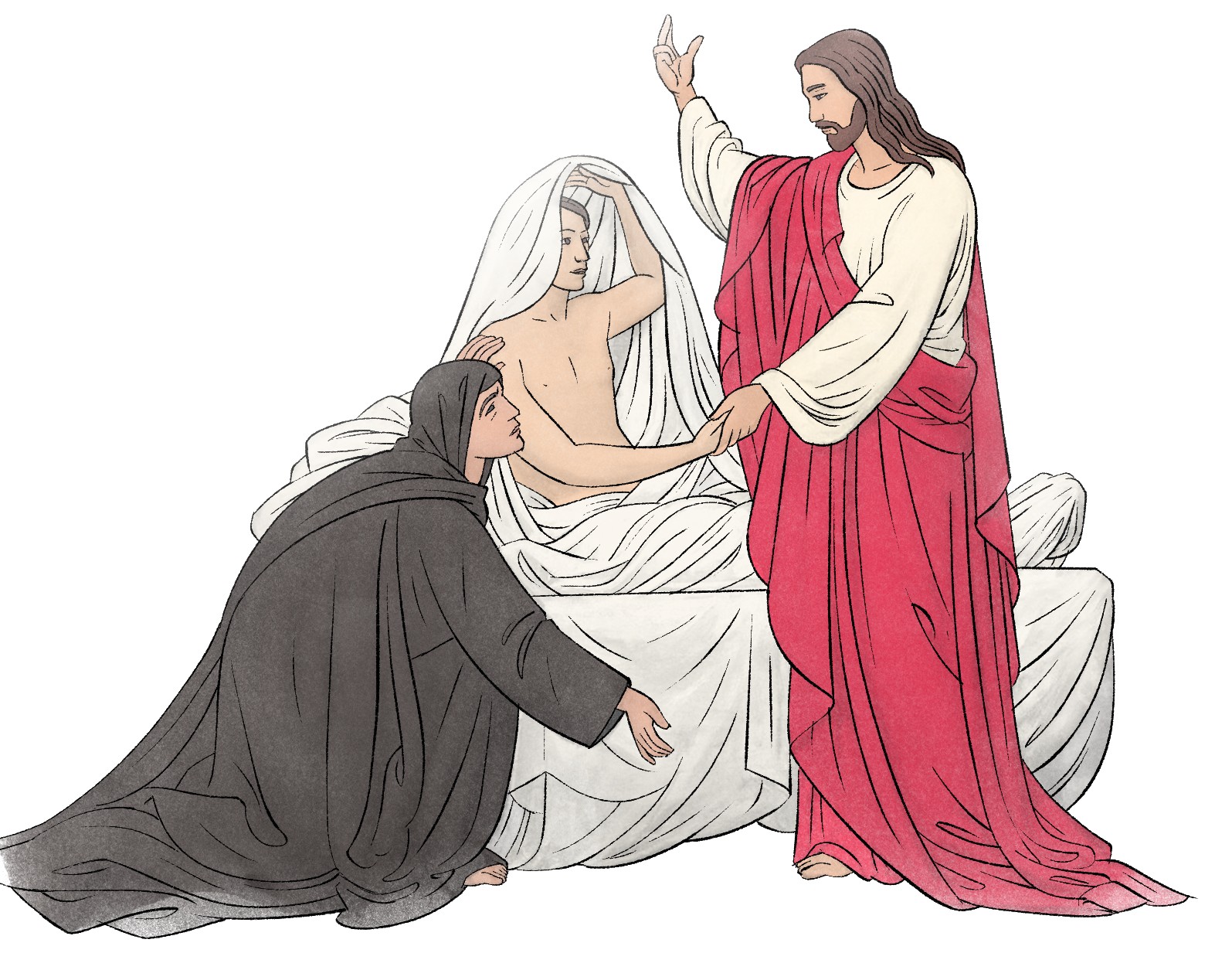 Le récit aurait pu s’arrêter là, chacun poursuivant sa route. Mais Jésus, après son regard et sa compassion, passe à l’action, comme le bon Samaritain de la parabole (Lc 10, 33-34); ce sont d’ailleurs deux récits propres à Luc. Que fait Jésus? Il intervient de trois manières. D’abord par sa parole de confiance adressée à la mère (Ne pleure pas), puis par son ordre de réveil adressé au jeune homme (Lève-toi), puis par la remise du fils à sa mère.