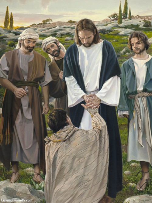 - Liz Lemon Swindle, 21e siècle, site ldsart.com, États-Unis. Cette artiste, membre aussi de l’Église de Jésus-Christ des Saints-des-Derniers-Jours, peint des œuvres religieuses très expressives et touchantes, avec des figures qui ont beaucoup d’humanité. Ici, nous sommes vers la fin du récit. Jésus est au centre et le Samaritain à ses pieds ; Jésus prend sa main dans les siennes. Il lui demande : où sont les neuf autres ? Trois disciples regardent avec attention. Entre la scène de la rencontre à l’avant et les murs du village à l’arrière, des pierres, de l’herbe verte et des arbres.