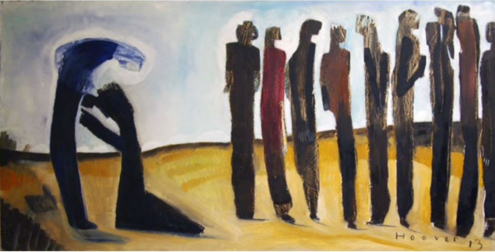 - Bill Hoover, 2013, site billhooverart.com, États-Unis. Cet artiste d’Omaha, au Nebraska, utilise divers matériaux pour ses œuvres, dont certaines sont non-figuratives. Il porte intérêt aux récits et au symbolisme. Ici, à droite et bien droits, les neuf lépreux guéris. À gauche, le Samaritain est aux pieds de Jésus, qui est penché vers lui et le touche. Le village est évoqué, à gauche, par des édifices et une clôture, dans un paysage dépouillé. Les couleurs des lieux et des figures font alliance.