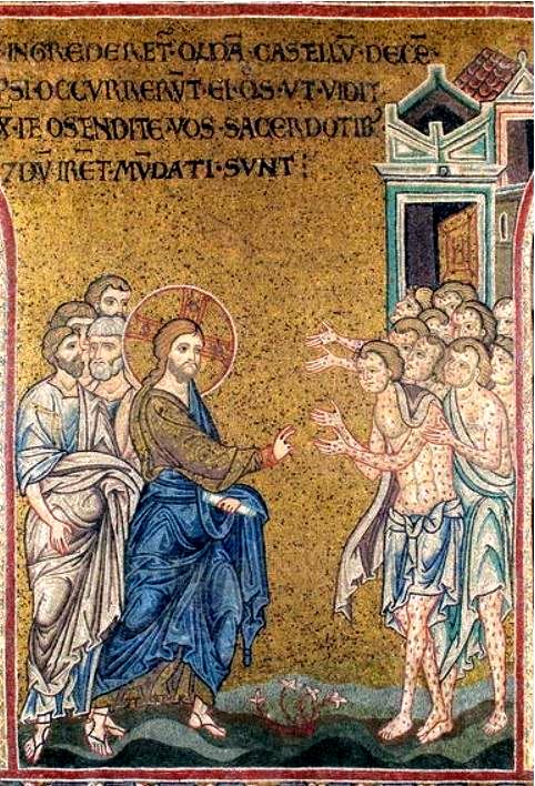 - Mosaïque, fin du 12e siècle, Cathédrale de l’Assomption, Monreale, Sicile, Italie. Cette église est remplie de mosaïques de style byzantin, dont un cycle de la vie du Christ. Celle-ci est située sur l’aile latérale nord. Jésus est le Maitre, le Pantocrator, qui a la puissance de guérir ces lépreux qui l’implorent. Il tient dans sa main gauche un rouleau de la Parole. Les quatre disciples derrière Jésus, dont Pierre, n’ont pas l’air très enthousiastes! Là aussi, le corps des lépreux est couvert de taches. L’inscription, en latin, reprend des phrases de l’évangile. Les éléments architecturaux réfèrent au village. Au sol, quelques fleurs disant la vie et l’espérance.