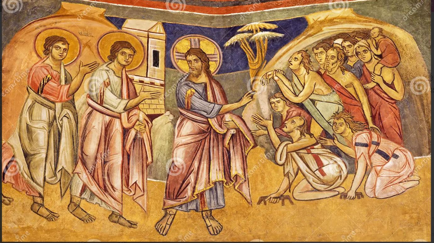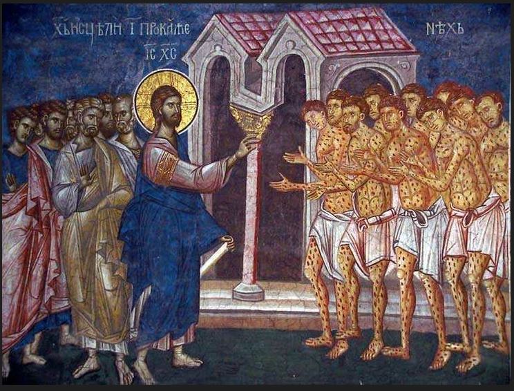 - Fresque, 14e siècle, Monastère de Decani, Kosovo. Ce monastère date de 1330 et relève de l’Église orthodoxe serbe. Le Kosovo, qui faisait partie de la Serbie, a déclaré son indépendance en 2008, mais elle est encore controversée. Nous retrouvons dans cette fresque plusieurs éléments déjà vus : les disciples à gauche, incluant Pierre, plus nombreux mais sur leur réserve; Jésus solennel qui bénit de la main droite et tient en main gauche le rouleau de la Parole; les lépreux tachetés et suppliant Jésus de leurs voix et mains; l’architecture évoquant l’entrée du village.