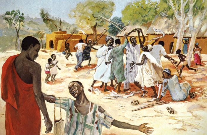 - JesusMafa, c.1975, Collectif pour la catéchèse, Cameroun. Le contexte de ces scènes évangéliques est celui du peuple Mafa, au nord du Cameroun. Bénédicte de la Roncière, une artiste française qui a publié plusieurs albums, a réalisé les illustrations finales. Les lépreux guéris exultent, libérés de leurs béquilles et bandages. Le lépreux reconnaissant rayonne de joie, aux pieds de Jésus, en rouge. Le village est bien visible, avec les huttes et les enfants qui courent.