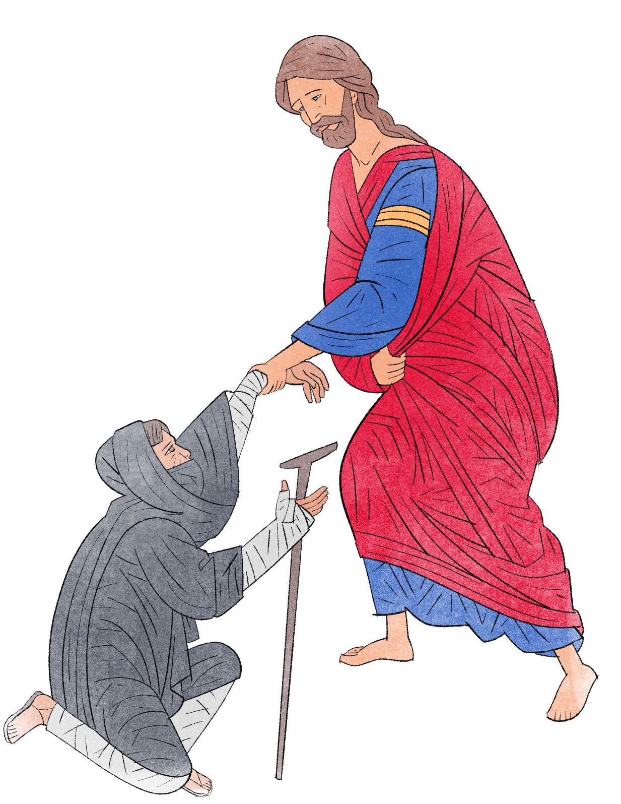 Les lépreux sont présentés dans leur condition physique et sociale par divers attributs : des marques sur le corps, un habillement particulier, des bandages, des bâtons et béquilles, … Jésus est solennel, manifestant son autorité et sa puissance de guérison. Il est fréquent que des disciples soient présents : en Luc, avant ce texte, ils accompagnaient Jésus.