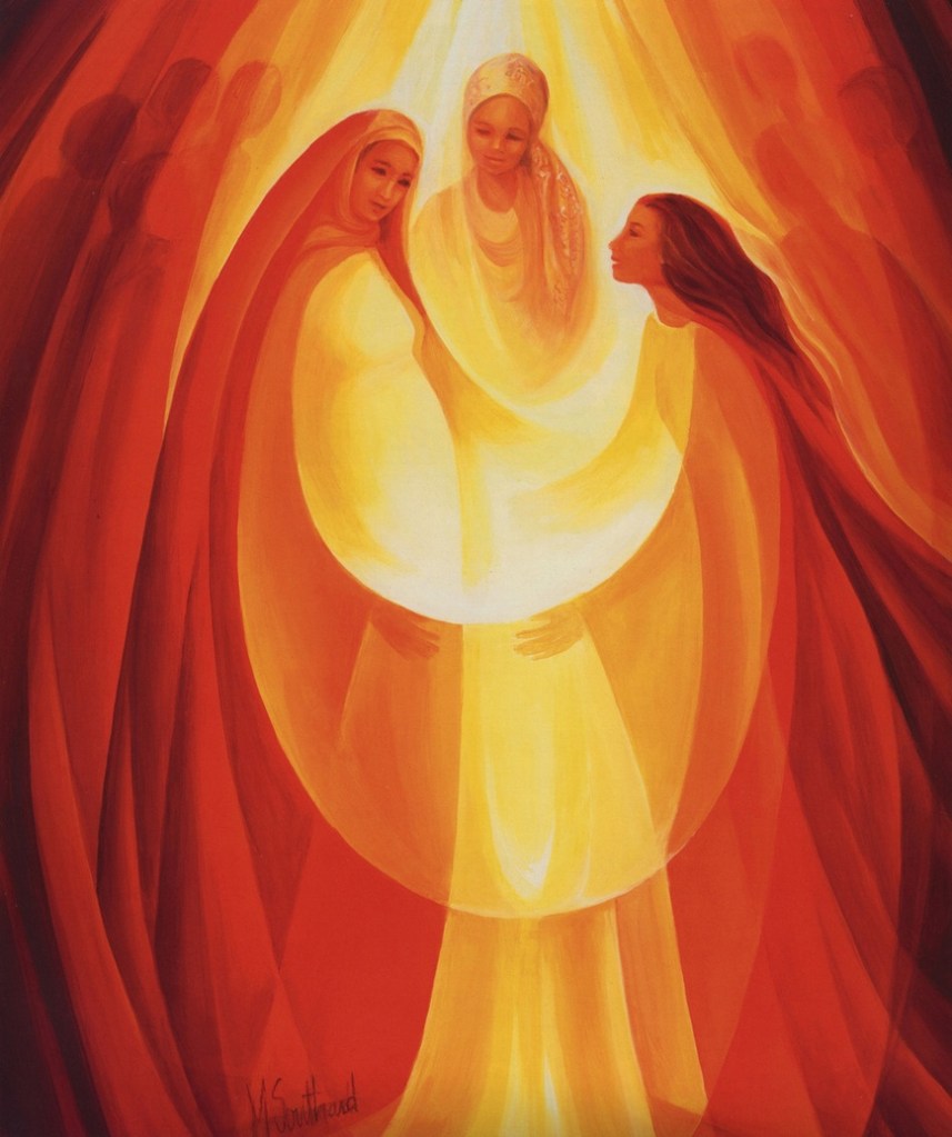 - Mary Southard, c.2004, (Visitation©Mary Southard, http://www.ministryofthearts.org. Used with permission), États-Unis. L’artiste est une religieuse de la Congrégation de Saint-Joseph (CSJ). Originaire du Wisconsin, elle vit à Lagrange Park dans l’Illinois. Elle y a co-fondé un Centre de spiritualité écologique. Marie et Élisabeth sont unies par les couleurs, rouge et or, et le mouvement des cercles; leurs mains se rapprochent l’une de l’autre. Au centre, joignant les deux femmes enceintes, émerge une coupe, en blanc, comme une offrande. Au fond, une figure féminine, mystérieuse : celle de Sara ou de la Sagesse? Voici une œuvre animée et inspirante.