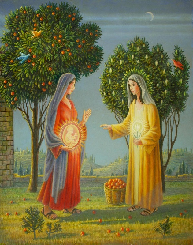 - Arcabas, 2002, Palais archiépiscopal de Malines, Bruxelles, Belgique. Voici une très belle œuvre de ce grand artiste français, de son nom Jean-Marie Pirot, décédé en 2018 à 91 ans. Marie et Élisabeth se regardent et s’accueillent tendrement. Zacharie, encadré du côté gauche, sert de témoin; nous pouvons nous joindre à lui. Au lieu des deux enfants, Arcabas a mis deux croix ; cette croix est aussi une signature fréquente dans ses œuvres. De l’élan, des couleurs et des figures qui habitent cette Visitation, se dégagent à la fois une légèreté et une profondeur invitant à l’intériorité.