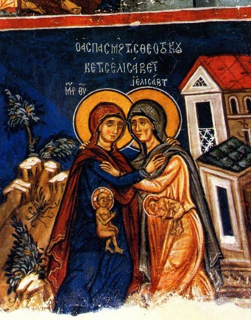 - Fresque, 14e siècle, nef, Église Sainte-Croix, Pelendri, Chypre. Cette petite église est inscrite au Patrimoine mondial de l’Unesco. Elle contient des fresques du 12e au 16e siècles. Celle-ci a été faite avant 1375. Marie et Élisabeth s’enlacent. L’enfant Jésus, avec un nimbe cruciforme, est assis et bénit Jean-Baptiste; lui aussi nimbé, il s’incline devant Jésus. Les deux sont nus et ont l’air de petits hommes. Édifices et paysage encadrent la scène. Ce style d’images de dévotion est populaire aux 14e et 15e siècles.