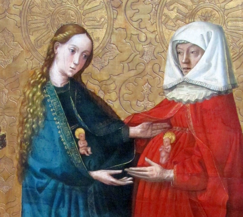 - Konrad Witz, c.1444, panneau (détail), Gemäldegalerie, Berlin, Allemagne. Cet artiste allemand a vécu à Bâle en Suisse. Il se situe à la frontière du gothique et de l’art nouveau. Cette Visitation fait partie d’une œuvre sur panneau de bois, Le Conseil de la Rédemption, qui montre la Trinité, Père, Fils et Esprit, sur un large trône, en discussion. Les deux femmes sont à droite de ce trône. Elles sont visiblement enceintes et proches l’une de l’autre; leurs mains sont expressives. Elles sont contrastées par leur âge et les couleurs de leur vêtement. Les enfants Jésus et Jean-Baptiste sont tous deux nimbés et nus; Jésus est assis et Jean est à genoux, rendant déjà hommage au Messie.