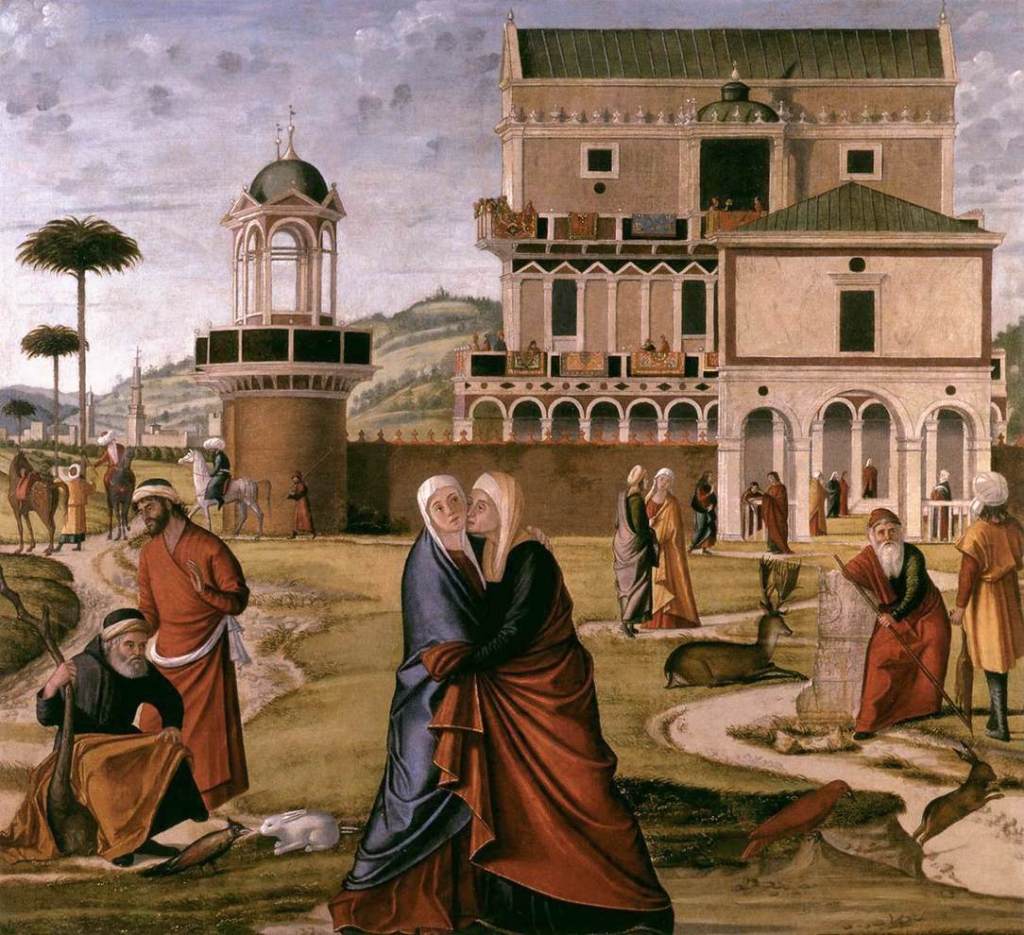 - Vittore Carpaccio, 1504-1506, Palais Ca’ d’Oro, Venise, Italie. Ce peintre fut actif à Venise, au moment de la prospérité et de la gloire de la ville. Cette œuvre fait partie d’une série de six scènes de la vie de Marie, faites pour l’École de Sainte-Marie des Albanais à Venise et maintenant dispersées. Carpacio insiste sur l’architecture, comme cette œuvre le montre clairement! Les deux femmes, au centre, se rencontrent et se donnent l’accolade; leurs époux Joseph et Zacharie ne sont pas loin, chacun avec son bâton. La beauté et la précision des édifices, les activités et vêtements des passants, nous parlent du début du 16e siècle à Venise, mais en intégrant des éléments du Proche-Orient : les turbans, les tours de style minaret, les tapis aux balcons, les palmiers. Plusieurs animaux et oiseaux sont présents, qui ont une portée symbolique. L’ensemble est complexe et intéressant.