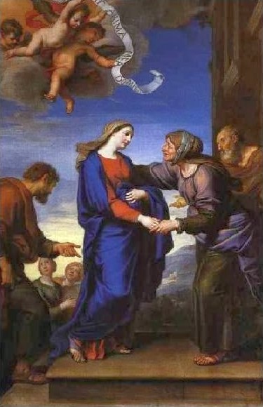 - Pierre Mignard, 1660, Chapelle de la Visitation, Monastère des Visitandines, Caen, France. Cette œuvre a été faite pour les Visitandines d’Orléans ; elle se trouve à Caen depuis 1985. L’Ordre de la Visitation, fondé en 1610 à Annecy par saint François de Sales et sainte Jeanne Chantal, a connu un grand rayonnement; dès ses débuts, il accueille les femmes de toute condition. Pierre, frère du peintre Nicolas Mignard et ami de Molière, s’inscrit dans le courant classique du 17e français. Élisabeth, visiblement plus âgée, accueille joyeusement Marie sur le perron de la maison. Zacharie et Joseph sont à leur côté, ce dernier s’adressant à un jeune couple. Des anges au-dessus portent sur un phylactère le début du Magnificat de Marie.