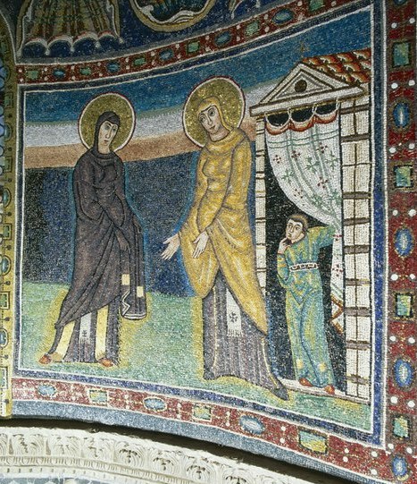 - Mosaïque, c.540-555, abside, Basilique Saint-Maur, Poreč, Croatie. Les mosaïques de style byzantin de cette église antique, remarquablement conservée, portent sur le Christ, la Vierge Marie, et les saints locaux. Celle-ci est à côté de l’Annonciation. Marie et Élisabeth, très bien habillées, sont enceintes et nimbées. Elle se saluent. Une jeune figure à droite ouvre un rideau pour assister à la scène. Est-ce toi, lectrice ou lecteur, qui veut regarder avec curiosité et attention ces images d’une rencontre?