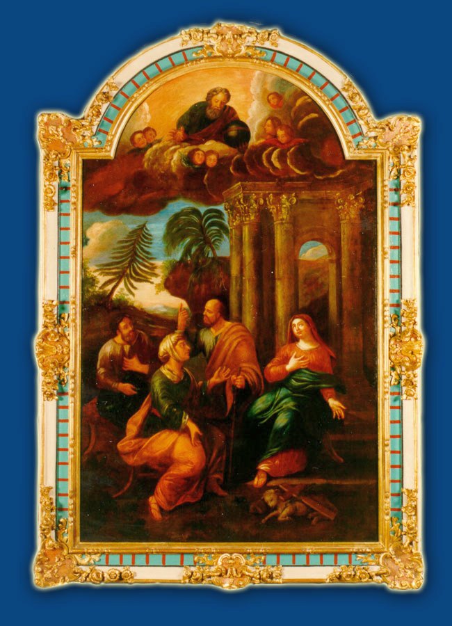 - Auteur inconnu, 18e siècle, Église de la Visitation, Montréal, Canada. Cette église de 1751 est la plus ancienne de Montréal; la Visitation est la fête patronale du diocèse, le 31 mai. La tableau, apporté de France, y fut mis en 1756. Il est une copie, ou plutôt inspiré, de celui de Pierre Mignard (cf. 9). On y trouve des éléments semblables, comme l’accueil, les époux, les anges, mais avec des variantes : les vêtements différents, les expressions des femmes et des époux, les anges vers la gauche, etc. L’œuvre porte une dimension méditative.