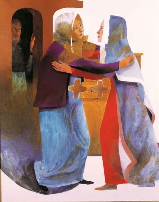 - Arcabas, 2002, Palais archiépiscopal de Malines, Bruxelles, Belgique. Voici une très belle œuvre de ce grand artiste français, de son nom Jean-Marie Pirot, décédé en 2018 à 91 ans. Marie et Élisabeth se regardent et s’accueillent tendrement. Zacharie, encadré du côté gauche, sert de témoin; nous pouvons nous joindre à lui. Au lieu des deux enfants, Arcabas a mis deux croix ; cette croix est aussi une signature fréquente dans ses œuvres. De l’élan, des couleurs et des figures qui habitent cette Visitation, se dégagent à la fois une légèreté et une profondeur invitant à l’intériorité.
