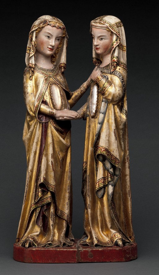- Heinrich de Constance, sculpture, c.1310-1320, Metropolitan Museum of Art, New York, États-Unis. Cette œuvre a été réalisée pour le monastère des dominicaines de Saint-Katharinental, au Lac Constance en Suisse, un centre important du renouveau spirituel et lié au frère Johan Eckhart. Haute de 59 cm, elle est faite de bois de noyer, de cristal de roche et de métal argenté. Marie et Élisabeth se tiennent la main avec affection. Marie, à gauche, tournée vers nous, porte une couronne. Les deux sont élégamment vêtues, avec un manteau brodé. Dans les formes ovales sur leur poitrine, se trouvaient des images des deux enfants, se regardant. L’œuvre exprime la joie de la rencontre.