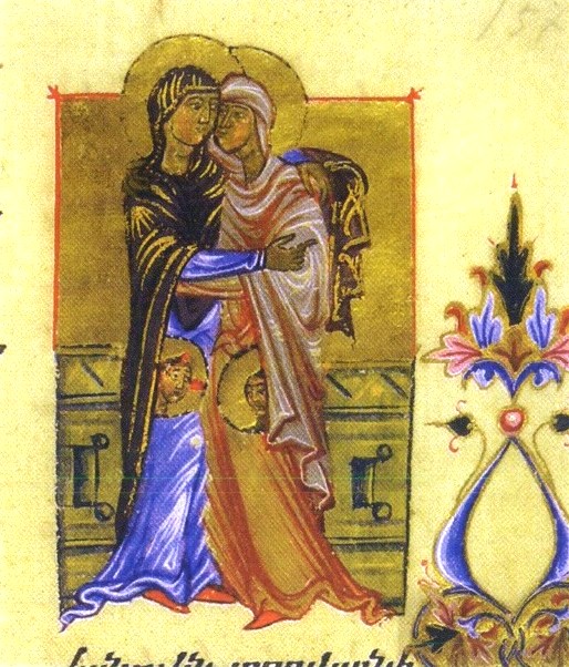 - Maître Avag, miniature, 1330-1337, Tetraévangile, folio 157v, Institut Matenadaran, Erevan, Arménie. La grande tradition arménienne d’enluminures est marquée par l’art byzantin mais elle a ses traits propres. Le peintre Avag, formé au monastère de Gladzor, a circulé en Cilicie et en Perse. Dans ce manuscrit des quatre évangiles, il montre les deux femmes qui se regardent et s’embrassent; leurs manteaux et leurs nimbes les rapprochent. Dans les médaillons sur leurs ventres, on voit non les deux enfants, comme en plusieurs œuvres de l’époque, mais les visages de Jésus et Jean-Baptiste, nimbés.