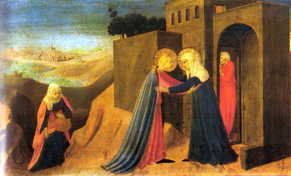 - Giovanni da Fiesole (Fra Angelico), prédelle, retable de l’Annonciation, c.1432-1434, Museo Diocesano, Cortona, Italie. Cette Visitation est une des six scènes de la prédelle. Cette œuvre du dominicain, patron des artistes, date d’avant les fresques de San Marco. Le paysage dit bien le déplacement, de la route à la maison, avec une montée qui demande effort. Marie et Élisabeth ont chacune une compagne. Cela dit le sens social des sociétés plus anciennes, par rapport au monde moderne des individus. Voici une femme plus jeune et l’autre plus âgée. Le vêtement d’Élisabeth, enceinte de six mois, est plus ample. Cette vue est le premier paysage identifiable dans l’art italien : la vallée de Chiana, la ville de Castigiano Florentina, et la tour de Monterchi, dans l’été toscan.