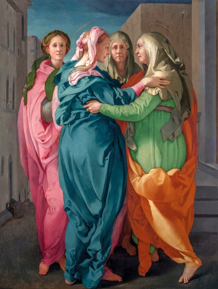 - Jacopo Carucci (Pontormo), 1528-1529, Église Saints-Michel-et-François, Carmignano, Italie. Ce peintre venant de Pontormo a passé sa vie à Florence, où il fut une figure majeure du courant maniériste, marqué par Raphael et Michel-Ange et se distanciant du naturalisme. Les effets et émotions, les distorsions et lignes courbes sont valorisés. À Marie et Élisabeth vues de profil, se joignent deux figures féminines qui regardent en face. Aux deux femmes en mouvement de rencontre, presque dansant, se posent en contraste les deux autres plus hiératiques, mais en continuité par les âges. Les couleurs sont vives et chatoyantes. À gauche, assis, deux hommes en miniatures; au fond (il faut une loupe!), la tête d’un âne (Za 9,9). Le tout offre une œuvre originale et surprenante.
