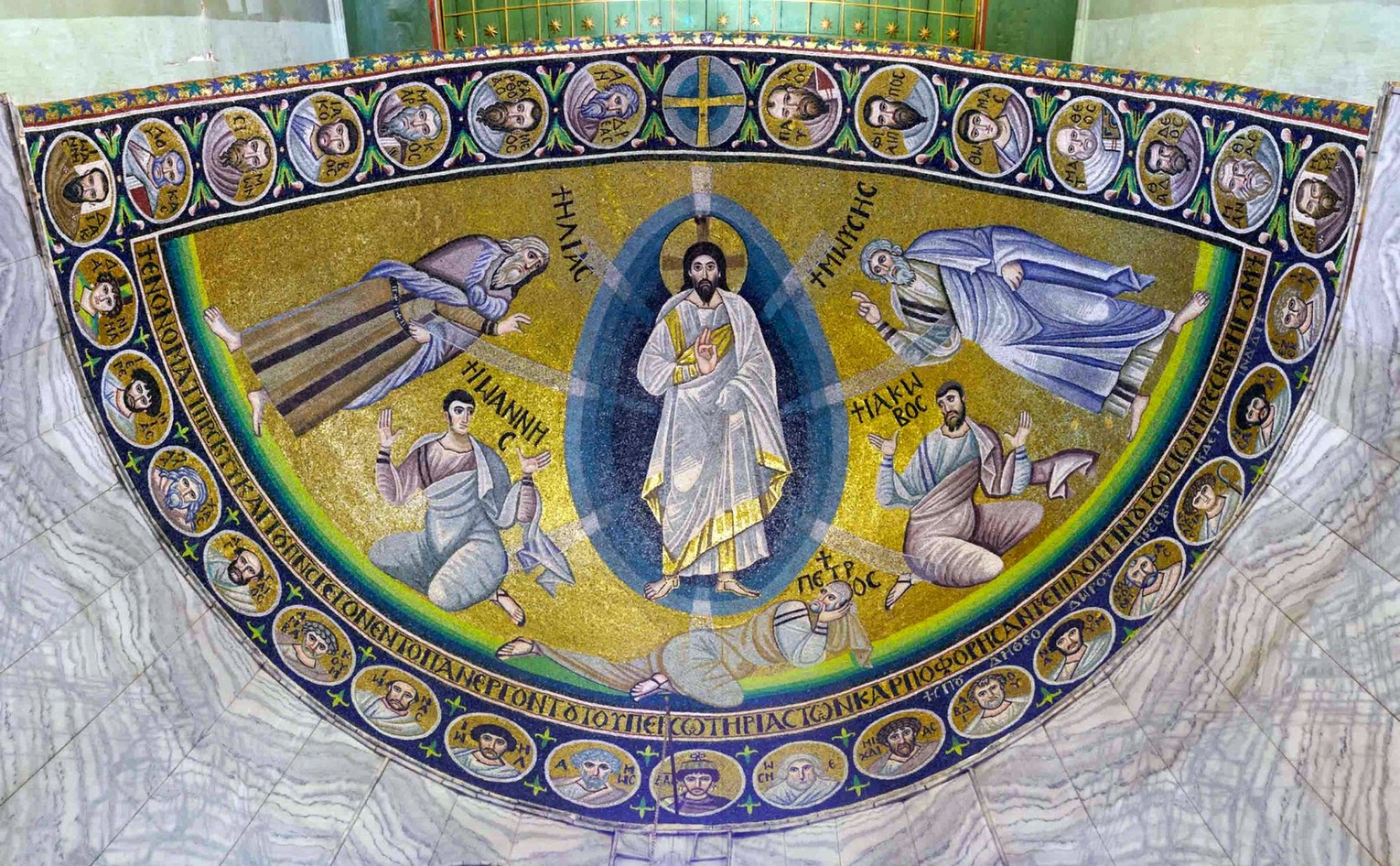 - Umberto Noni, mosaïque, 1924, abside, Basilique de la Transfiguration, Mont Thabor, Israël. Cette église des Franciscains, relevant de la Custode de la Terre sainte, se trouve sur le Mont Thabor, en Galilée, où aurait eu lieu la Transfiguration. Cette immense mosaïque a été réalisée par un artiste de Trieste. Sur un fond doré, le Christ, en blanc et flottant dans les airs au-dessus d’un nuage, est tourné vers le ciel. Moïse, à gauche, et Élie, bien identifiés, sont debout sur un nuage. Élément inusité, le trio apostolique est séparé : Pierre, à gauche, Jacques et Jean, à droite, regardent le Christ avec une certaine surprise ou stupeur. La montagne n’est pas que rocher et pierres mais des plantes y poussent, ce qui aussi n’est pas courant. Sous la mosaïque, il est écrit : Et il est transfiguré devant eux.