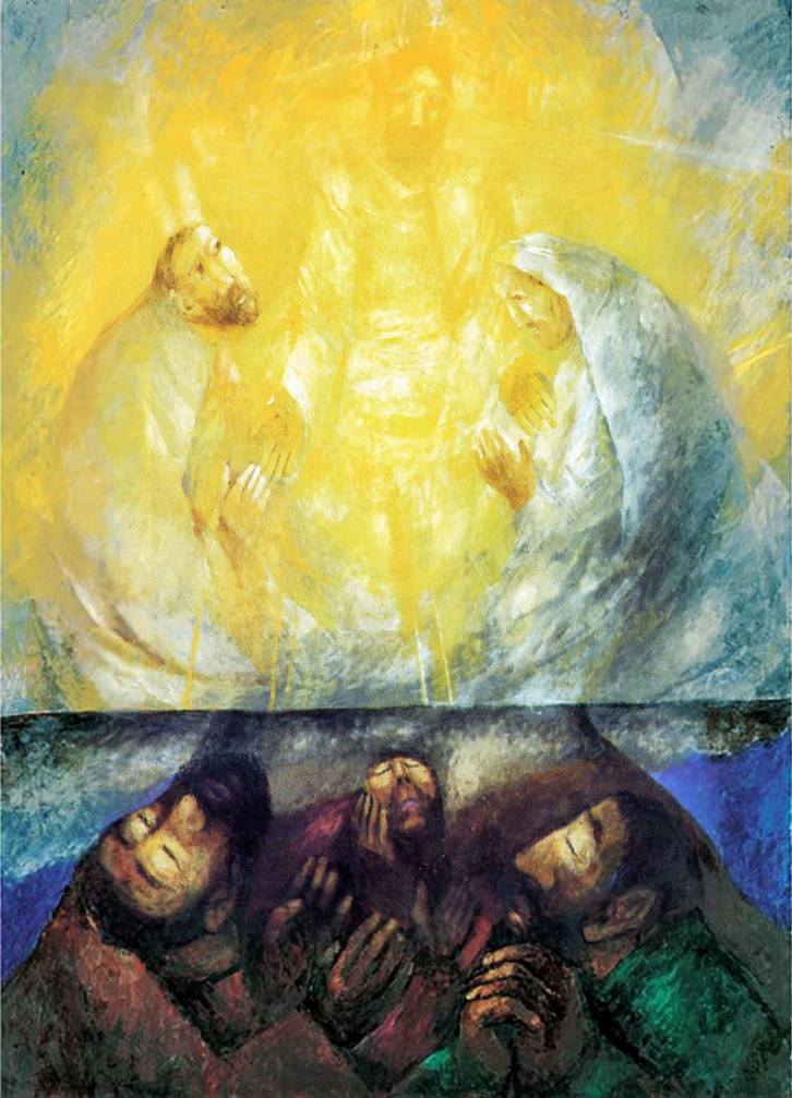 - Sieger Köder, 2005, Collection privée, Allemagne. Originaire de Wasseralfingen près de Stuttgart où il a étudié en art, ce grand artiste est mort en 2015 à 90 ans. Jeune soldat, il est prisonnier de guerre à Saint-Malo en France. Orfèvre et peintre, marqué par Chagall, et aussi enseignant en art, il est ordonné prêtre en 1971, à 46 ans. Il combine son ministère en paroisse et son travail artistique. Ici, les deux espaces sont clairs. Les trois disciples, yeux fermés, aveuglés et comme en extase, vivent une expérience forte. Moïse à gauche et Élie sont agenouillés et recueillis, non pas debout; ils font partie du cercle de lumière avec le Christ. Celui-ci, dont on ne voit pas clairement le visage mais qu’on devine, comme en d’autres œuvres de Koder (Cène, Lavement des pieds, Emmaüs), est pure lumière, rayonnante. Je peux m’approcher un peu et fermer les yeux pour en recevoir un rayon …