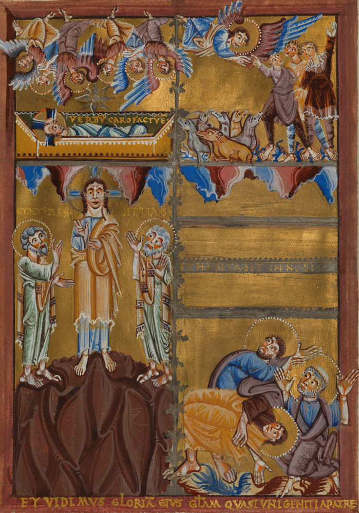 - Miniature, c.1050, Évangéliaire de Cologne, Bibl. 94, f.155, Staatsbibilothek, Bamberg, Bavière, Allemagne. Ce manuscrit de la période ottonienne et de l’École de Cologne contient les quatre évangiles. Le Christ, au nimbe cruciforme et imberbe comme dans l’Antiquité, est posé sur une élévation, avec Moise à notre gauche et Élie à droite (les noms sont écrits). Les trois disciples, en postures d’ébahissement et le regard tourné vers le Christ, sont placés sur le côté droit, à part, ce qui est une approche rare. En bas, il est écrit : Et nous avons vu sa gloire ... Sur la même page, en haut, on voit une scène de la Nativité : le Christ dans une mangeoire, qui a l’air plus d’un petit homme que d’un enfant, avec des anges et trois bergers et leur troupeau. Il est écrit : Le Verbe s’est fait chair. Voici un rapprochement intéressant entre les deux mystères, l’Incarnation et la Transfiguration.