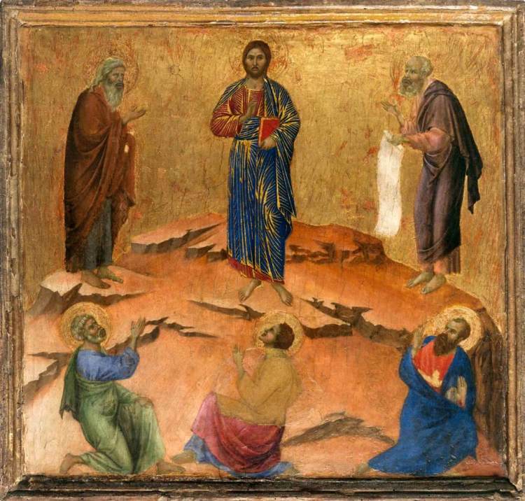 - Duccio di Buoninsegna, 1308-11, National Gallery, Londres, Angleterre. Cette oeuvre faisait partie de la prédelle arrière de la Maestà, célèbre retable qui est surtout au Duomo de Sienne. Le peintre de Sienne est un des rares en Occident, à cette époque, à intégrer la Transfiguration dans les séries sur la vie du Christ; mais il y a chez lui influence de l’art byzantin. Sur un fond doré, Jésus, Moïse et Élie sont placés sur le même sommet. Le Christ Pantocrator, bénissant et portant le livre de la Parole, est majestueux dans son habit rouge et bleu aux lignes dorées. À droite, Moïse tient un rouleau déroulé; et à gauche, Élie a aussi la Parole en main. Pierre, Jean et Jacques expriment la stupéfaction et la révérence.