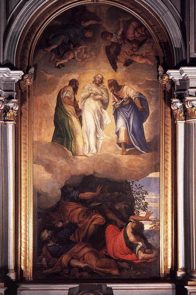 - Paolo Véronèse,1555-56, Cathédrale Santa Maria Assunta, Montagnana, Province de Padoue, Italie. Originaire de Vérone, Paolo Caliari a fait carrière à Venise. Son sens des couleurs et de la perspective a exercé une grande influence sur plusieurs artistes par la suite. Ici, nous voyons deux espaces bien distincts. Sur le nuage, Jésus en blanc, au visage un peu incertain, est en conversation avec Moise, à gauche, et Élie à droite; cette proximité des trois figures n’est pas fréquente dans l’iconographie de la Transfiguration. Les disciples, dans l’ordre Pierre, Jacques et Jean, couverts par le nuage, sous celui-ci, sont confus et effarés. En haut, des anges virevoltent. Le visage de Pierre ressemble à celui du peintre. Le tout a un effet dramatique et saisissant. Il s’agit vraiment d’un moment spécial.