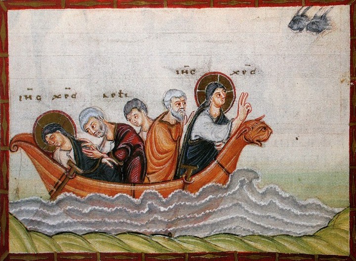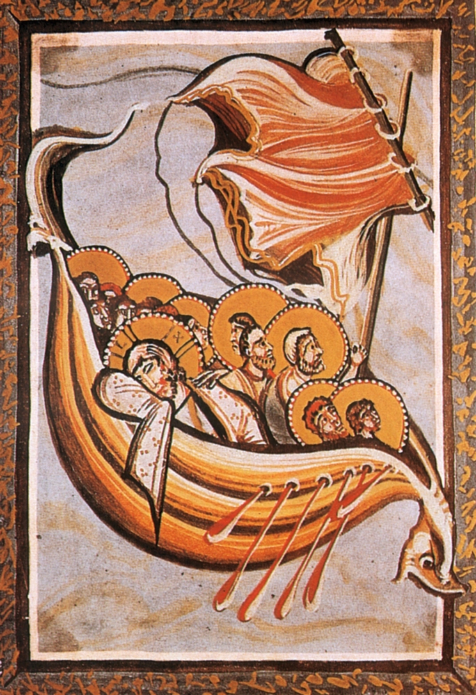 1. Miniature, Codex Egberti, 980-990, fol.24r, Bibliothèque municipale de Trèves, Allemagne. Ce lectionnaire a été fait par le scriptorium de l’Abbaye bénédictine de Reichenau pour Egbert, archevêque de Trèves. Il comprend 51 miniatures. Ici, comme en plusieurs oeuvres médiévales, le début et la suite du récit sont montrés : on voit Jésus endormi, à gauche, et Jésus réveillé menaçant les vents, à droite. Ceux-ci sont personnifiés. Pierre, Jean et Jacques, ses proches, sont avec Jésus dans la barque.