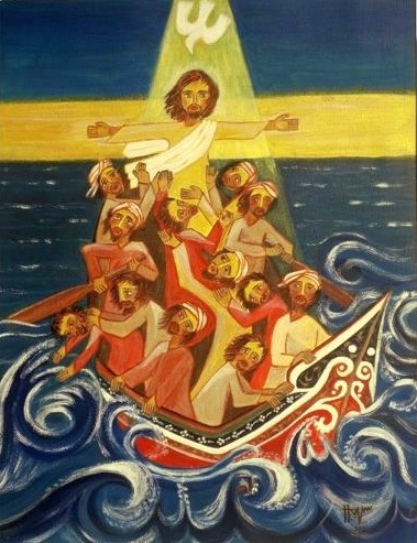 1. Hanna-Cheriyan Varghese, 2000, site hanna-artwork.com, Malaysie. Cette artiste de Malaysie a été aussi engagée dans l’Association asiatique des artistes chrétiens. Elle est décédée en 2008. Elle a été présente déjà dans cette chronique (Samaritaine, Emmaüs). La scène est montrée de front. Les douze apôtres sont inquiets et agités, comme la mer. Mais le Christ à l’arrière, bras étendus, le crucifié et le ressuscité, porteur de lumière, maîtrise la situation. Une colombe est au-dessus de sa tête, comme à son baptême (Mc 1,10).