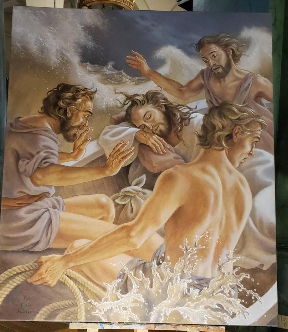1. Pierre Lussier, 2016, site pierrelussier-peintre.com, Canada. Ce peintre de Québec, membre du Racef, est attentif à l’environnement naturel et à l’interaction entre les figures, avec finesse et intériorité. Pierre, Jean et Jacques entourent Jésus qui dort paisiblement. Ils vont le réveiller pour qu’il vienne à leur secours. La barque est entourée de vagues vives et périlleuses. Mais du visage de Jésus et de la douceur des couleurs mêmes de l’œuvre, une paix émerge.
