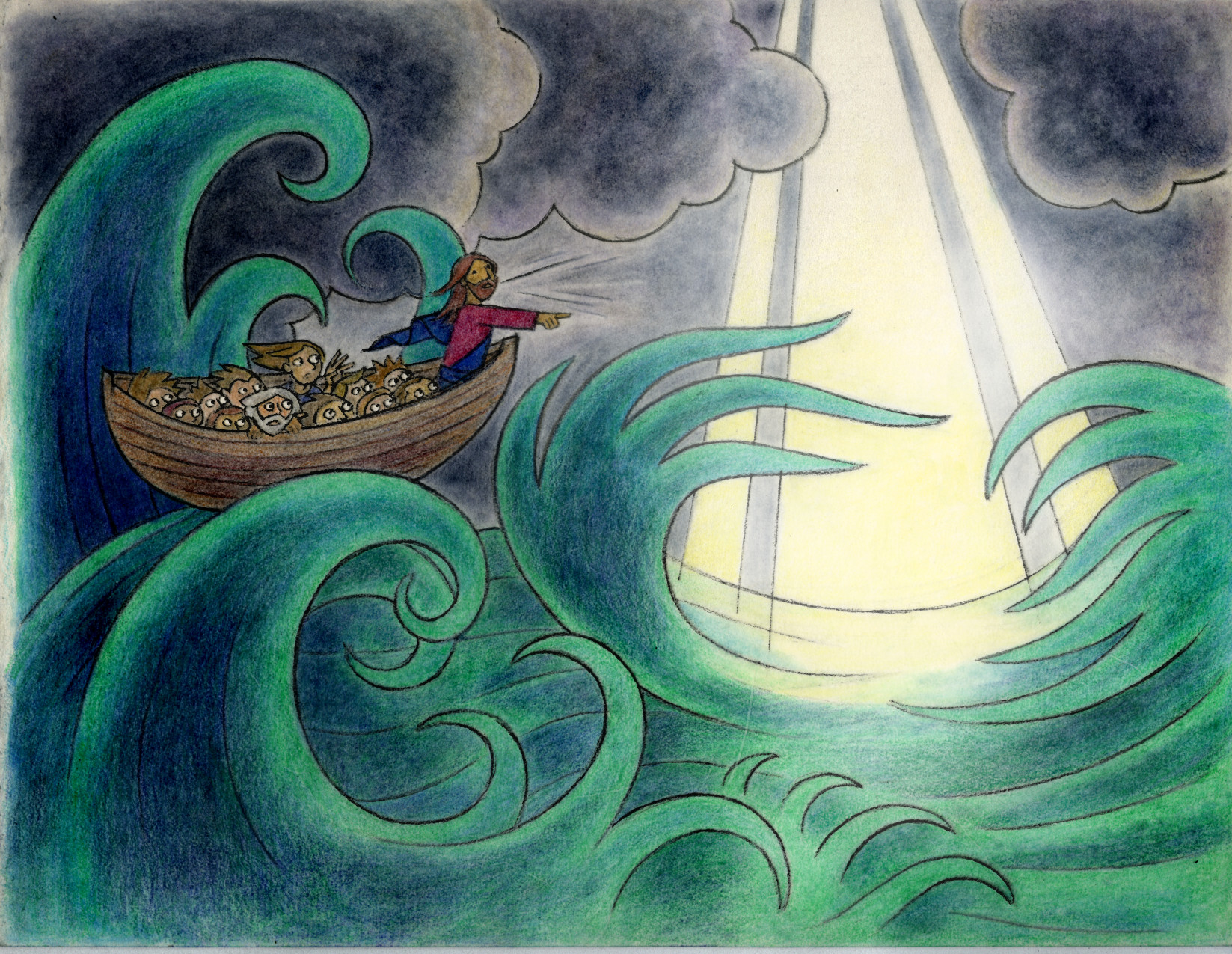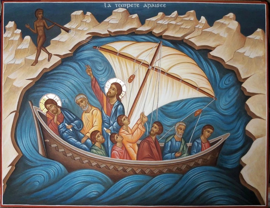 C’est d’une telle crise communautaire que Marc nous parle dans son récit de la tempête apaisée. La symbolique de la barque évoque la communauté des disciples avec son Maître Jésus. Ils sont ensemble et loin de la foule anonyme. L’enjeu de ce récit est donné clairement par Jésus : Passons sur l’autre rive (v.35). Il s’agit d’un passage à vivre, comme groupe. Et ce passage sur une autre rive ne sera pas facile. Il est même assez terrifiant! La mer, dans la Bible, n’est pas un lieu de loisir agréable ni un espace indifférent. C’est un lieu de dangers, rempli de forces hostiles. Sa symbolique évoque la mort et le mal. Ce n’est pas par hasard que, dans le livre de l’Apocalypse (21,1), des cieux nouveaux et une terre nouvelle sont annoncés mais non une mer nouvelle : elle a disparu! Autre façon, dans la logique symbolique, d’annoncer la victoire de la vie sur la mort.