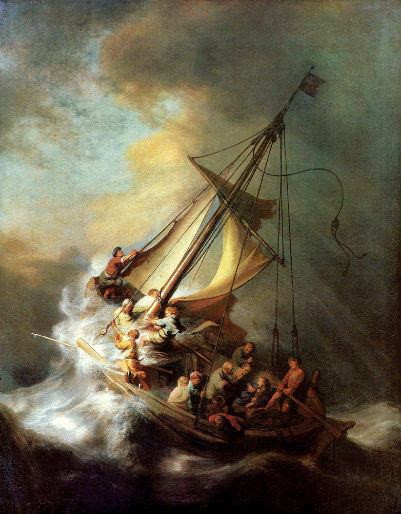 1. Rembrandt van Rijn, 1633, localisation inconnue. Cette peinture était au Isabella Stewart Gardner Museum, à Boston, où elle a été volée en 1990. Elle date des débuts du peintre à Amsterdam. C’est sa seule œuvre navale. La scène est dramatique. Le navire, plus qu’une simple barque, est menacé par une forte vague. Lumière et ténèbres s’affrontent. Nous sommes au milieu du récit : Jésus est éveillé et calme, mais le vent règne encore. Les douze sont affairés ou près de Jésus. À l’avant, l’un d’eux vomit. Un autre se tient au cordage et nous regarde; son visage est celui du peintre.
