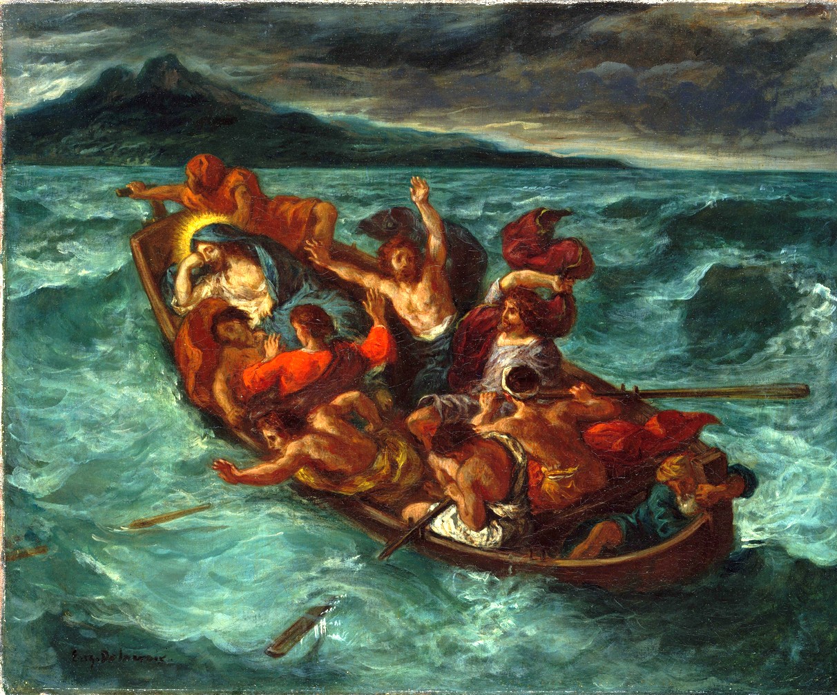 1. Eugène Delacroix, 1853, Metropolitan Museum of Art, New York, États-Unis. Ce peintre fut une figure centrale du courant romantique dans l’art du 19e siècle français. Son travail sur les couleurs a influencé plusieurs artistes de la période moderne. Il a fait plusieurs versions de cette scène. Ici, tout est en mouvement et l’environnement bleu-gris, ciel-mer-terre, est menaçant. Jésus dort paisiblement dans la barque alors que les disciples sont énervés. L’un à l’avant s’accroche; d’autres affolés et bras levés vont le réveiller. Mais un disciple lui aussi dort tranquille, près de Jésus.
