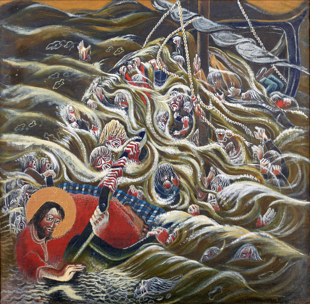 1. Giorgio de Chirico, 1914, Musée du Vatican, Rome. Cet artiste italien, formé à Athènes et Munich, a vécu en France et en Italie. Il fut un innovateur, controversé, s’inscrivant dans le courant métaphysique et le mouvement surréaliste, puis plutôt dans le néo-classicisme. Jésus, rayonnant et vêtu de rouge, est bien endormi à l’arrière de la barque. Un disciple va le toucher à l’épaule pour le réveiller et demander son aide. Les autres sont occupés avec la voile et le gouvernail. La terre est proche. La forme de la barque avec sa voile ainsi que l’environnement de la mer et du ciel expriment l’intensité et le mouvement de cette traversée.