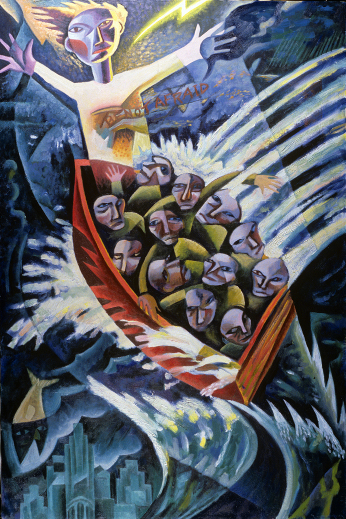 1. Jim Janknegt, 1990, site bcartfarm.com, États-Unis. Cet artiste du Texas fait des œuvres très sensibles au contexte contemporain, marqué par la vie urbaine, la violence et le commerce. Il s’est aussi converti au catholicisme, en 2005. La barque est prise dans un tourbillon de vagues et de vents agressifs, avec des disciples apeurés. Mais le Christ, à l’arrière, est agissant pour maitriser les éléments. Sa parole est écrite en rouge : Be not afraid (N’ayez pas peur). En bas, à gauche, des édifices suggèrent le monde actuel.
