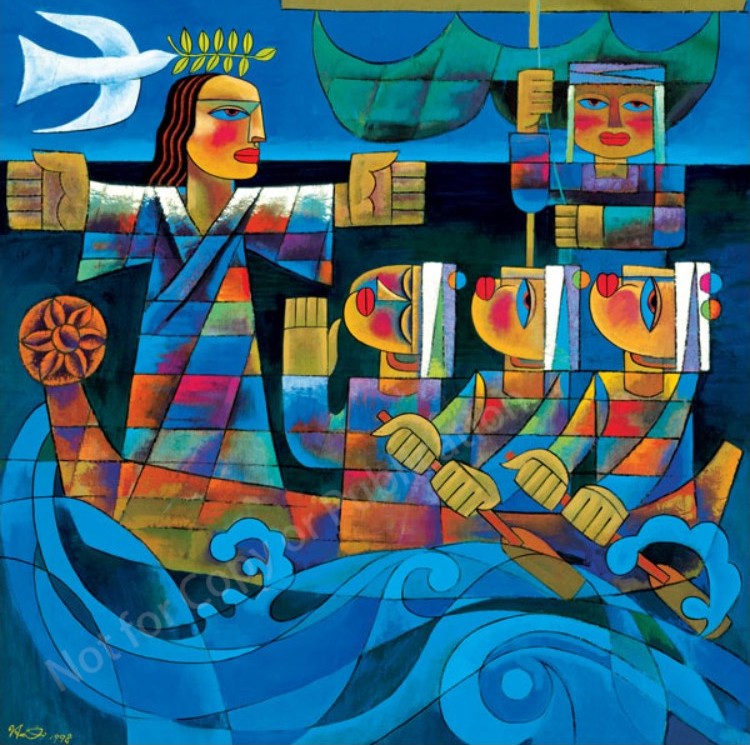 1. He Qi, 1998, site heqiart.com. Cet artiste chinois, formé à Nanking et Hambourg, vit maintenant en Californie. Il a été très engagé dans l’Association asiatique des artistes chrétiens. Il allie des approches traditionnelles chinoises avec des éléments de l’art contemporain. Nous sommes ici au moment final. Le bleu domine et apaise. Jésus, aux bras étendus, domine la mer et ses menaces. Une colombe avec une branche d’olivier, disant la paix, est au-dessus de sa tête, comme après le déluge (Gn 8,11). Formes et couleurs s’unissent dans l’harmonie.